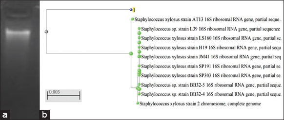 Molecular identification of the isolated osmotolerant bacteria (B-6 and B-7) was performed by PCR amplification of 16SrRNA sequences. For this 16 S rRNA gene of both the isolates was amplified by PCR successfully, then the amplified products were checked with agarose gel electrophoresis [Figures 1a and 2a]. The results of the gel electrophoresis revealed that the size of the PCR-amplified products of both isolates was approximately 2500bp (2.5 kb). The amplified products were sequenced and the sequences were generated in FASTA format. These resultant sequences were compared with the NCBI nucleotide database using BLAST-N comparison. The BLAST-N comparison study revealed 100% similarity of the isolate B-6 with Staphylococcus aureus strain GCC_20MS (NCBI accession number MZ305087.1) and 97.85% similarity of the isolate B-7 with Staphylococcus xylosus strain AT13 (NCBI accession number MW175729.1). The determined 16S rRNA sequences of both the isolates (B-6 and B-7) were submitted to the database of NCBI, GeneBank under the accession numbers (OM993290) (OM860203), respectively. The phylogenetic tree study of the isolated osmotolerant bacteria (B-6 and B-7) was performed and the data are shown in [Figures 1b and 2b].