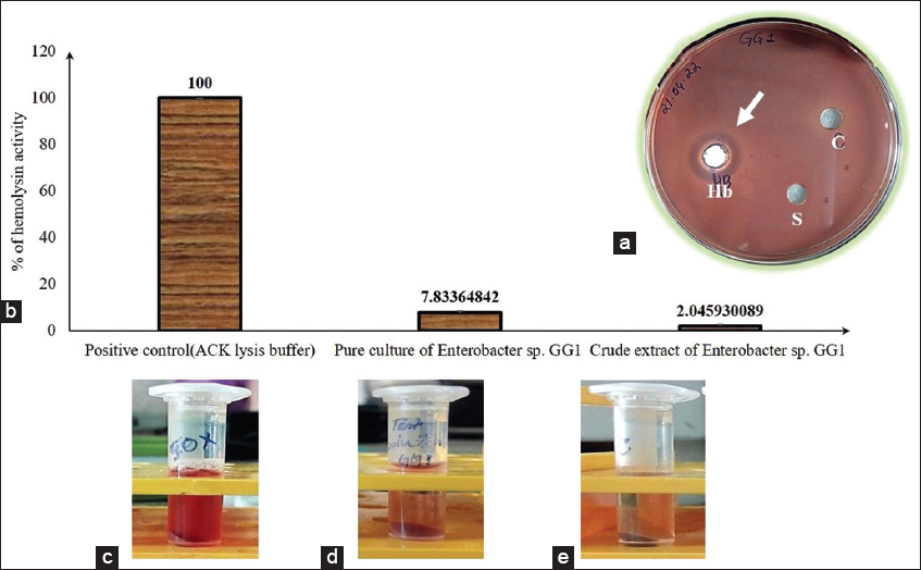 | Figure 6: Enterobacter sp. GG1 bacterial hemolysis assay; (a) hemolysis assay in sheep blood agar plate, when Hb = ACK lysis buffer, C = Enterobacter sp. GG1 pure culture, and S = Enterobacter sp. GG1 crude culture; (b) comparative study of hemolysin activity in sheep blood broth media (n = 3), (c) hemolysin activity of ACK lysis buffer, (d) hemolysin activity of Enterobacter sp. GG1 pure culture, (e) hemolysin activity of Enterobacter sp. GG1 crude culture. [Click here to view] |