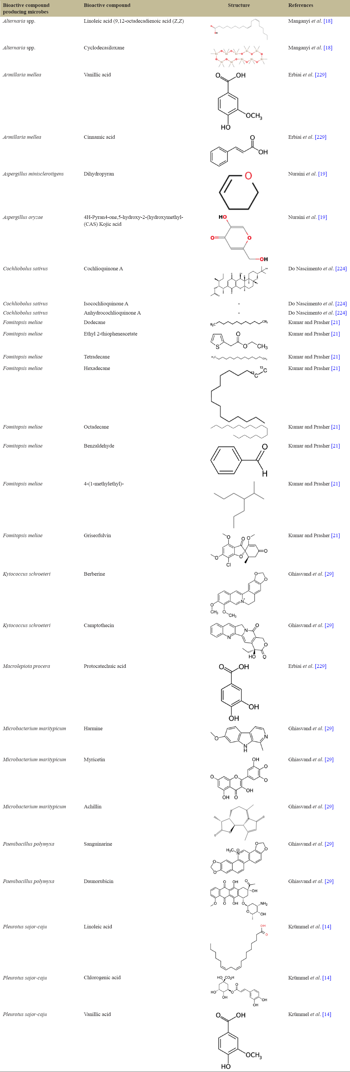 Microfungi are considered to be a treasure trove of bioactive compounds. Wang and Xu [16] reviewed beauvericin, which is a cyclic hexadepsipeptide mycotoxin. It is known to possess cytotoxic, antiviral, insecticidal, and antimicrobial activities. It is also known to be a potential agent for pesticides and medicines. Its production has also been known in Beaveria bassiana and Fusarium spp. Kumar et al. [17] reviewed endophytic fungi as a source of bioactive compounds with antimicrobial activities. Manganyi et al. [18] screened bioactive compounds from endophytic fungi of Pelargonium sidoides. The chemical analysis of the extract from Alternaria spp. indicated that linoleic acid (9,12-octadecadienoic acid (Z,Z) and cyclodecasiloxane and concluded that both the compounds could be responsible for the antibacterial activity. Nuraini et al. [19] reported dihydropyran and 4H-Pyran4-one, 5-hydroxy-2-(hydroxymethyl-(CAS) Kojic acid from Aspergillus minisclerotigens and Aspergillus oryzae respectively. Jamal et al. [20] reported bioactive metabolites of isoelemicin, terpinen-4-ol, eucalyptol, oleic acid, and β-pinene from endophytic fungi isolated from Gynura procumbens. Kumar and Prasher [21] reported dodecane, ethyl 2-thiopheneacetate, tetradecane, hexadecane, octadecane, benzaldehyde, 4-(1-methylethyl)-, and griseofulvin from Fomitopsis meliae.