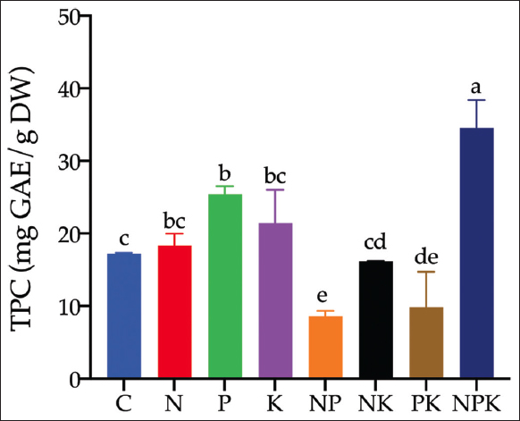 The NPK fertilizers treatment using a single nutrient, a combination of two nutrients, or a complete combination of NPK significantly affected the TPC of C. xanthorrhiza [Figure 1]. TPC levels of C. xanthorrhiza after treatment with different combinations of NPK fertilizers ranged from 8.61 mg GAE/g dry weight (NP treatment) to 34.54 mg GAE/g dry weight (NPK treatment). Interestingly, It is noteworthy that the single nutrient (N, P, K) contributed better to the increase in TPC than the combination of two nutrients (NP, NK, PK). Moreover, the TPC in the control sample was increased compared to the two-nutrient combination treatment. TPC in phosphorus and NPK treatment was higher and remarkably different compared to the control treatment.