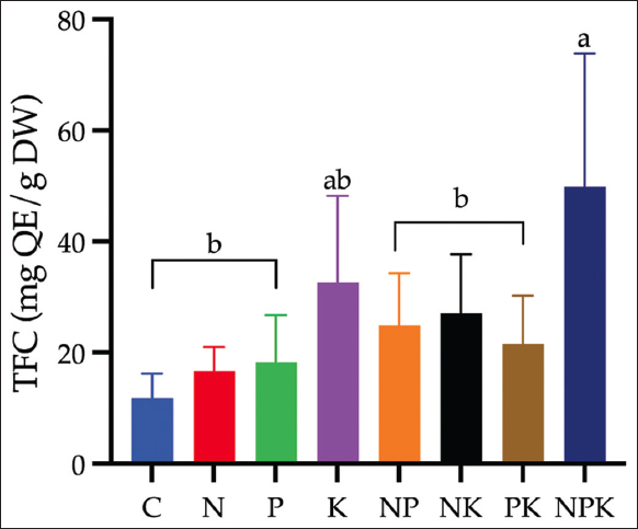 The effect of NPK fertilizer treatment on the TFC of C. xanthorrhiza is illustrated in [Figure 2]. The highest TFC was recorded in the NPK treatments at 50.00 mg QE/g dry weight, while the lowest TFC was recorded in the control treatment at 11.83 mg QE/g dry weight.