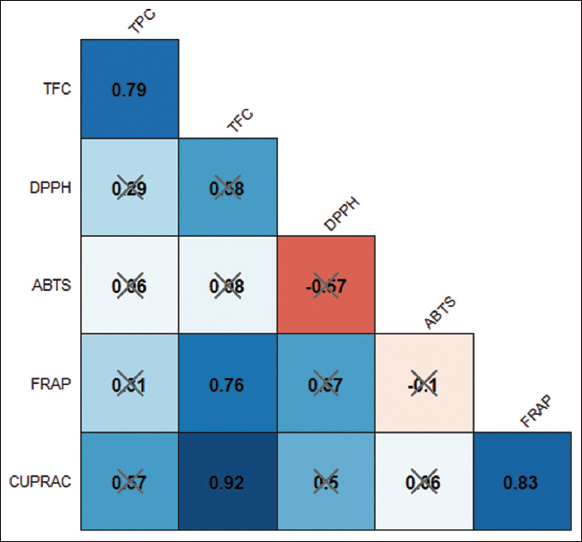 | Figure 3: The correlation plot of polyphenols and antioxidant capacity of Curcuma xanthorrhiza. The value inside each box represents the correlation coefficient between the variables, which was statistically tested at a 5% level of significance. The presence of a cross indicates that the correlation is not statistically significant. [Click here to view] |
