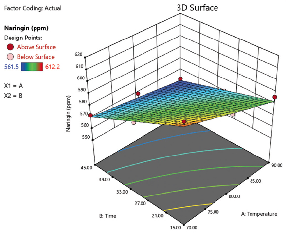 The naringin content of thermally processed juice varied from 561.50 to 612.20 ppm with an average value of 580.42 ppm [Table 2]. The higher naringin content in grapefruit juice was found at the combination of temperature and time at 70°C and 15 s. Whereas the lower naringin content in grapefruit juice was observed at the combination of temperature and time at 90°C and 45 s. The value of the predicted R2 (0.8259) is in acceptable agreement with the adjusted R2 of 0.9433 [Table 3]. The visual presentation for naringin content is given in the 3D surface plot [Figure 1] by comparing the effects of temperature and time by setting the reference point at the center point coded as 0 for both temperature and time in the design space. In a study on the effect of ultrasound processing of kiwifruit juice, Wang et al. [18] revealed that the flavonoids, total phenolics, and antioxidant capacity of ultrasound-processed juice samples significantly increased by 105.56%, 108.65%, and 65.67%, respectively, compared to the control group. In a similar study, Igual et al. [3] reported a significant reduction in naringin content in pasteurized grapefruit juice.