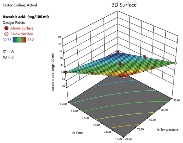 The ascorbic acid content of thermally processed grapefruit juice varied from 32.75 to 38.20 mg/100 mL with an average value of 35.14 mg/100 mL [Table 2]. The higher ascorbic acid content of grapefruit juice was found at the combination of temperature and time at 70°C and 15 s. Whereas the lower ascorbic acid content of grapefruit juice was found at the combination of temperature and time at 90°C and 45 s. The value of the predicted R2 (0.979) is in acceptable agreement with the adjusted R2 of 0.982 [Table 3]. The visual presentation for ascorbic acid content is given in the 3D surface plot [Figure 2] by comparing the effects of temperature and time by setting the reference point at the center point coded as 0 for both temperature and time in the design space. Wurlitzer et al. [21] stated that the pasteurization process caused a significant depletion of the ascorbic acid content in the tropical juice blend. Igual et al. [17] supported the use of microwave treatment as an alternative to conventional pasteurization. They showed that thermal treatment at 95°C significantly decreased the ascorbic acid content in grapefruit juice, while microwave treatment preserved the ascorbic acid content. In a similar study on pear juice pasteurization, Saeeduddin et al. [22] reported that pasteurization at 95°C resulted in higher degradation of total phenols, ascorbic acid, and flavonoids than the ultrasound-pasteurized pear juice.