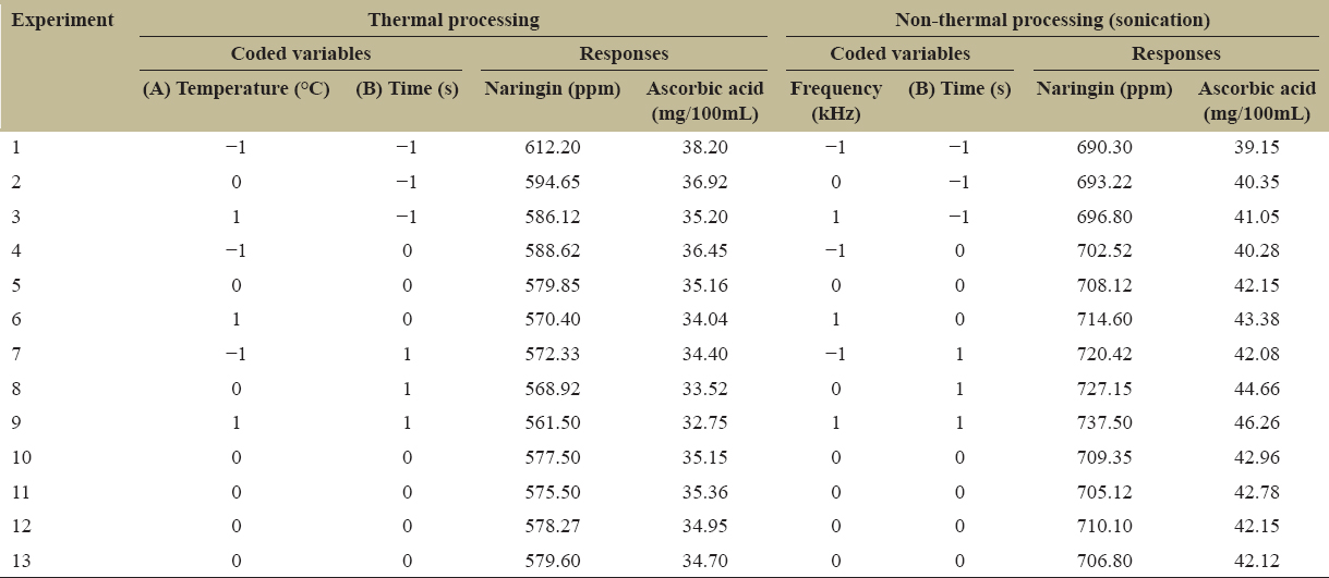 Variations in naringin and ascorbic acid content of thermal and non-thermal processed grapefruit juice were observed as dependent variables with respect to desired variable combinations of independent variables. The values of independent variables at three levels of factorial experimental design are presented in Table 1. There were 13 experiments in experimental design as presented in coded levels [Table 2]. For both thermal and non-thermal processed juice, a two-factor interaction model was fitted to assess the applicability of process variables on naringin and ascorbic acid content. To facilitate the visual presentation of responses with respect to variables, plots were obtained using the Design-Expert trial version (State-Ease, Minneapolis, MN).