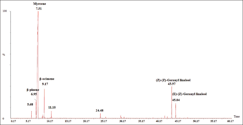 Rhizomes of C.amada yields a good amount of essential oil (0.12–1.35% v/w) [Table 2] which was a pale yellow liquid having a strong aroma. It was reported that 0.5% (v/w) of rhizome oil yield on fresh weight basis taken from the foothills of Uttarakhand, India [25], while 1.25% (v/w) of rhizome oil yield was reported from Kerala Agriculture University, India [26]. Later, in the present experiment, the RO was subjected to GC-MS analysis which detected 56 peaks. The analysis revealed a total of 84.38–97.37% detectable area percentage comprising all major and minor constituents. Parenthetically, the C. amada ROs of all the accessions were composed mainly of monoterpenoids (89%) with 83% hydrocarbons and 6% of oxygenated counterparts [Figure 2]. Alike the present study findings monoterpenoids (97.22%) with a major 96.75% of hydrocarbon fraction and 0.97% of oxygenated ones were found predominantly in C. amada RO [25]. The essential oils of the mango ginger (Curcuma amada) accessions were found to contain a total of 56 compounds. The major constituents identified were myrcene (67.59–72.97%), (Z)-(Z)-Geranyl linalool (4.3–7.79%), (Z)-(E)-Geranyl linalool (4.05–7.23%), β-ocimene (2.9–6.33%), and β-pinene (1.23–4.82%). Additionally, α-pinene (0.1–0.96%) and (E)-caryophyllene (0.01–1.95%) were present as minor constituents in the essential oils [Table 3 and Figure 3]. A similar study on C. amada RO reported myrcene (40%) and β-pinene (11.78%) as the major constituents [7]. On contrary, a phytochemical screening of RO EOs detected 28 constituents in which ar-curcumene (28.1%), camphor (11.2%), β-cumene (11.2%), curzerenone (7.1%), and eucalyptol (6.0%) were identified as the major constituents which deviate from the present study findings [27]. The analysis result showed a mixture of different compounds in which oxygenated sesquiterpenes (17 compounds) were found in majority followed by oxygenated monoterpene (13 compounds) and monoterpene hydrocarbons (12 compounds). The characteristic aroma of C. amada is contributed by the various combinations of compounds, that is, myrcene, ocimene, cis-, and trans-dihydroocimene [28].