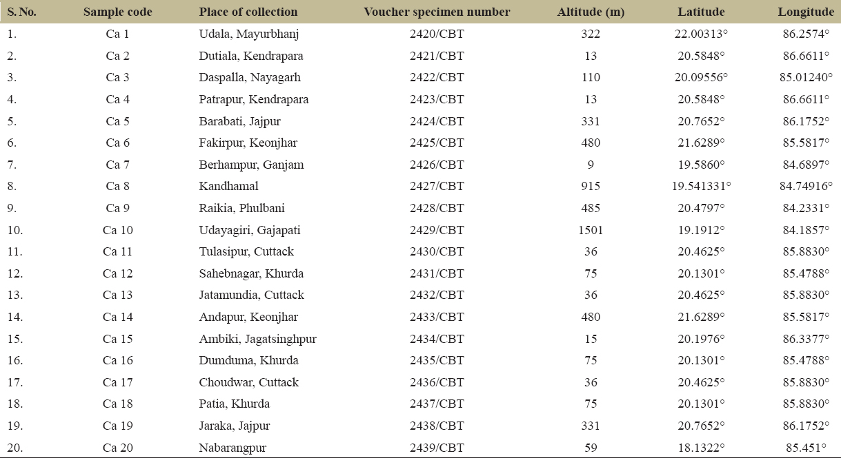 The plant samples of different accessions of C. amada were collected from various geographical locations of Odisha [Table 1 and Figure 1] and were later identified by a taxonomist. The identified samples were planted in the green house for sample maintenance in the Siksha O Anusandhan herbarium for further future use.
