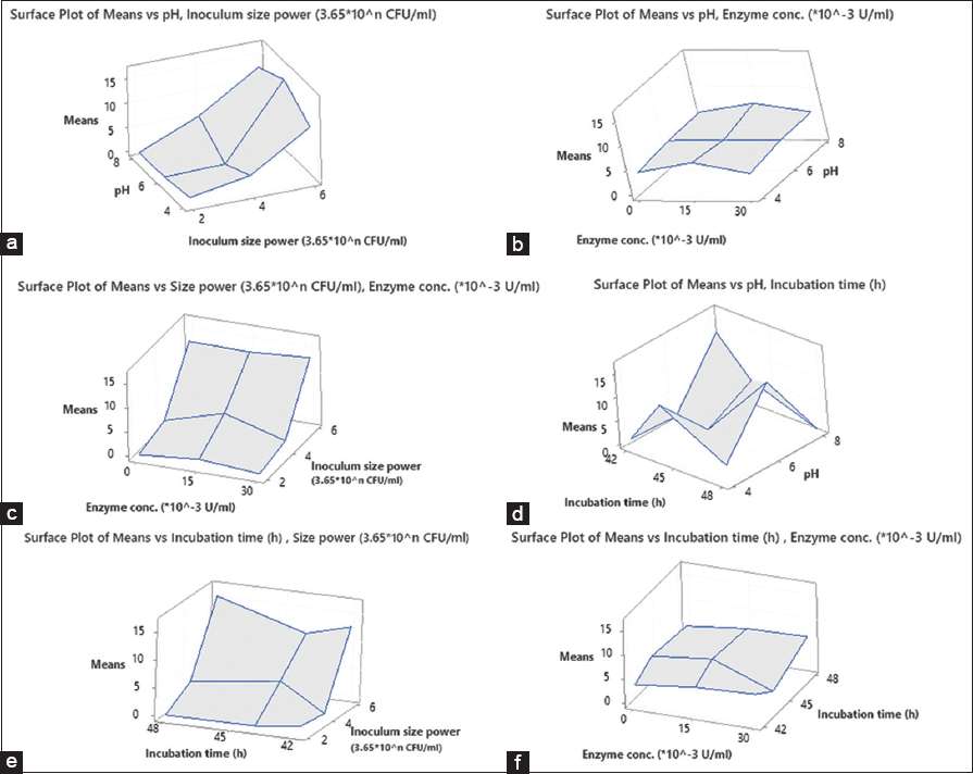 Finally, AChEI% was successfully maximized by 60% from 9.84% to 16.55 after the Taguchi optimization. The Pareto chart of the standardized effect for each term and its interactions prove that only the inoculum size power had the utmost significant effect on the AChEI% [Figure 13].