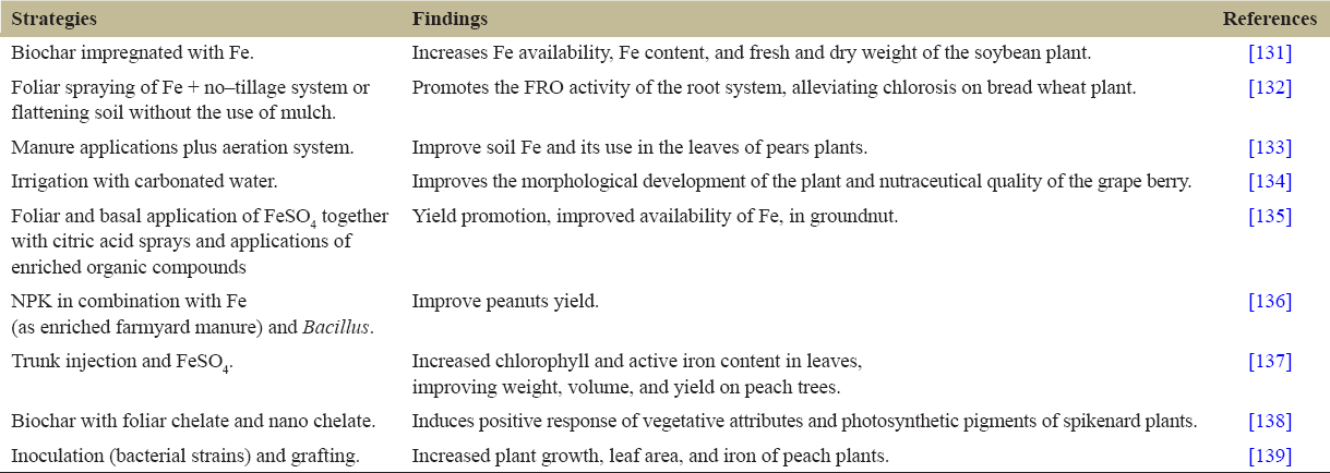Combinations of these strategies have been reported as being suitable tools for improving plant Fe nutrition by promoting Fe availability in calcisols [131-139] [Table 1]. Plant chlorosis can be alleviated by organic management practices, coupled with proper water management. This method reduces the soil pH, which affects the availability, mobilization, and uptake mechanisms of Fe [132-136]. It is possible that these practices can supply Fe to plants in the form of natural chelates, slowly and continuously [136], generating an increase in active Fe in the plant tissues. This increase, mainly in the apoplast, alters the source-sink distribution rate, alleviating IDC [137].