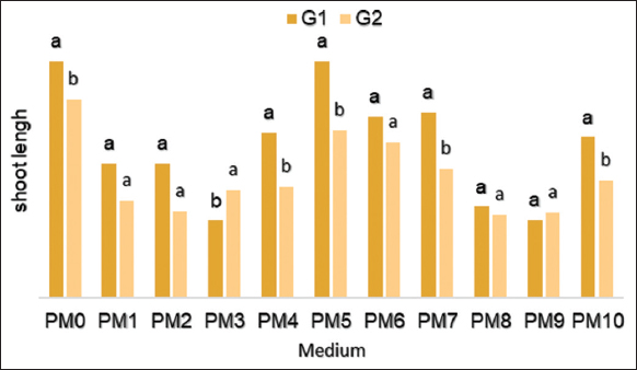The variance analysis showed that the length of new axillary shoots was significantly influenced by different combinations and concentrations of PGRs and by genotypes (P < 0.0001). The highest average length was recorded on PM0 and PM5 mediums [Figure 3] for both genotypes. The G1 grows more vigorously with an average length of 9.21; 9.22 cm respectively on the PM0 and PM5 media against 7.73; 6.5 cm for G 2.