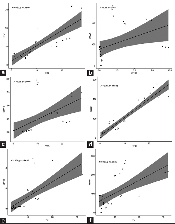 | Figure 1: Simple linear correlation of total phenolic content (TPC) with total flavonoid content (TFC) (a), DPPH with FRAP (b), TPC with DPPH (c) and FRAP (d), TFC with DPPH (e) and FRAP (f). R = value Pearson’s correlation coefficients, ρ = significance. [Click here to view] |