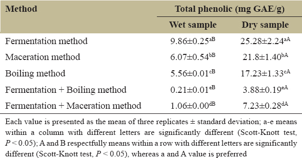 | Fermentation + Boiling method | 0.21±0.01eB | 3.88±0.19eA |