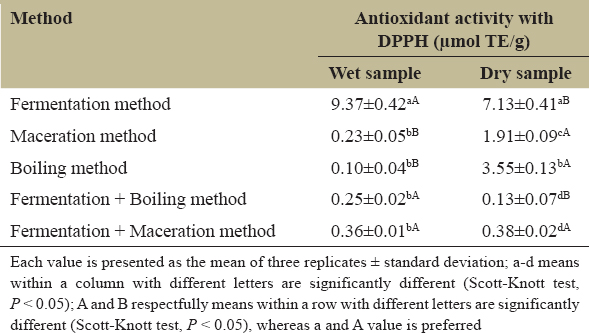 | Method | Antioxidant activity with DPPH (µmol TE/g) | |
