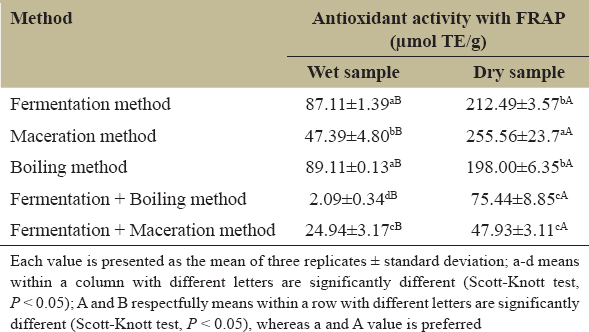 Antioxidant activity in this study was analyzed using the DPPH and FRAP methods. The antioxidant activity with the DPPH method can be seen in Table 3. The free radical DPPH, widely used to evaluate the ability of compounds to operate as free-radical scavengers and hydrogen suppliers, is a rapid, simple, and inexpensive method for testing antioxidant capabilities. The DPPH test relies on eliminating DPPH, a stabilized free radical. The free radical DPPH test with wet samples showed the highest value in the fermentation extraction method, 9.37 μmol TE/g. These results were significantly different from other free radical DPPH tests; the lowest DPPH activity was described in the boiled extraction method with a value of 0.10 μmol TE/g. The free radical DPPH test with dry samples showed significantly varied results; the highest value obtained in the fermentation method was 7.13 μmol TE/g, while the lowest was in the fermentation + boiling combination method at 0.13 μmol TE/g. The determination of antioxidant activity by fermentation in O. stamineus is still difficult. However, the results of this study confirm the previous research by Ejuama et al. [16], which stated that there was an increase in DPPH radical scavenging activity through the fermentation method.