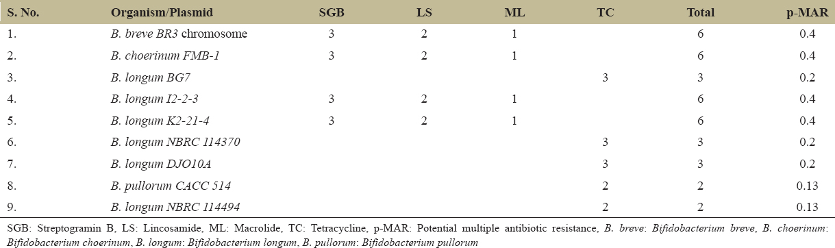 | S. No. | Organism/Plasmid | TC | BL | Total | p-MAR |