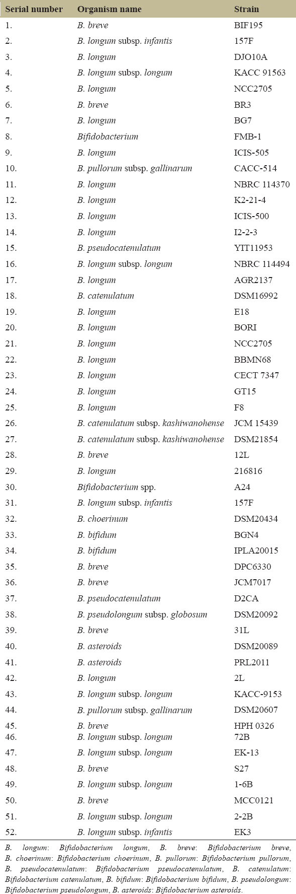B. longum: Bifidobacterium longum, B. breve: Bifidobacterium breve, B. choerinum: Bifidobacterium choerinum, B. pullorum: Bifidobacterium pullorum, B. pseudocatenulatum: Bifidobacterium pseudocatenulatum, B. catenulatum: Bifidobacterium catenulatum, B. bifidum: Bifidobacterium bifidum, B. pseudolongum: Bifidobacterium pseudolongum, B. asteroids: Bifidobacterium asteroids.