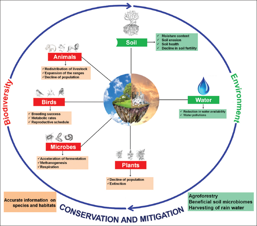 | Figure 1: Depicts the effect of climate change on biodiversity and environment and their conservation/mitigation strategies. [Click here to view] |