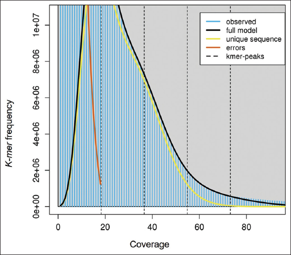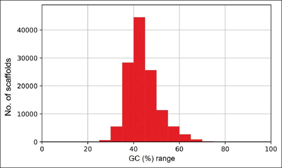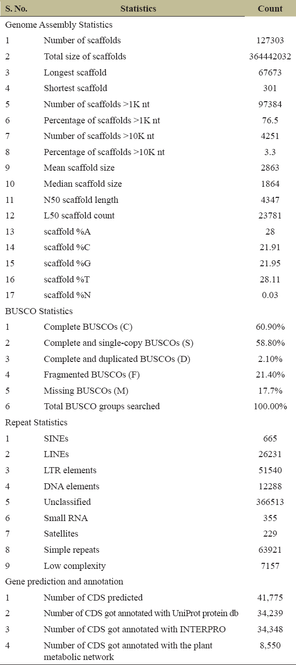 The whole-genome sequence data of 28.96 GBs from NCBI Bio project PRJNA610008 is retrieved. There were 194,645,804 reads, 44.237% of G.C. content, and 94.72% data ≥Q30 with read length 2 × 150bp. The adapter removal and quality trimming resulted in 194,640,684 reads, 44.23% of G.C. content, and 94.8% data ≥Q30. The genome size of 454,049,232 bps is predicted for lemon grass [Supplementary Figure 1]. The de-novo assembly generated 127,303 scaffolds, with an assembly size of 364,442,032 bps. The longest scaffold is 67,673 bps, and the shortest scaffold is 301 bps. Table 1 presents the genome estimation summary of lemon grass. The assembled genome’s G.C. content and scaffold length distribution are calculated and shown in Supplementary Figures 2 and 3, respectively. The G.C. content of the assembled genome is ~43.86%. The evaluation of the genome using BUSCO version 4.1.2., predicted that the genome assembly of lemon grass was complete by 60.9% [Table 1 and Supplementary Table 1].