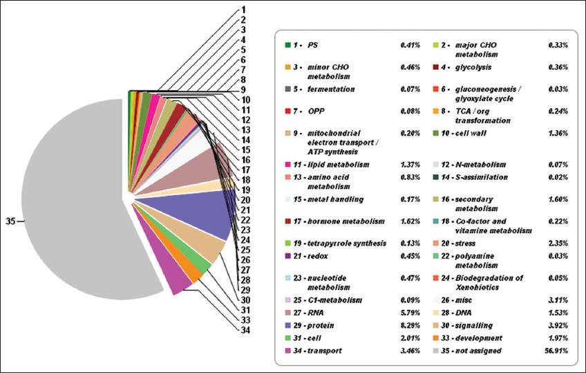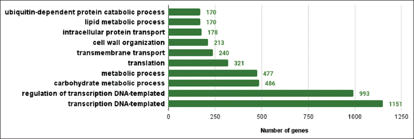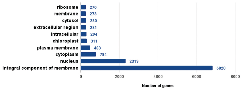 The gene prediction based on AUGUSTUS version 3.3.2 revealed 41,775 genes. Nearly 34,239 were annotated based on best hits with the UniProt protein database [Table 1]. InterproScan was used to annotate genes resulting in the annotation of 34,348 genes. The KEGG analysis predicted many significant pathways in lemon grass. The Gene Ontology categorization identified 1745 genes associated with biological processes, 484 genes related to cellular components, and 1373 genes linked with molecular function [Supplementary Figures 4-6]. The Mapman analysis identified 43.09% of genes having a significant role in metabolic pathways [Supplementary Figure 7]. Plant metabolic network analysis identified 8550 genes associated with metabolic pathways. A linear tree presents phylogenetic relationships of nine species based on the maximum likelihood method [24,33]. It is viewed in Figtree [34] to understand the phylogenetic relationship between the models and C. citratus, as shown in Supplementary Figure 8. The linear tree showed that lemon grass is close to S. bicolor, followed by Z. mays, S. italica, and D. oligosanthes. The orthologous study considered 562,517 genes, and nearly 447,596 (79.57%) genes are in orthogroups. The number of orthogroups identified in this study is 26,100, and Supplementary Table 4 presents the orthologous summary.