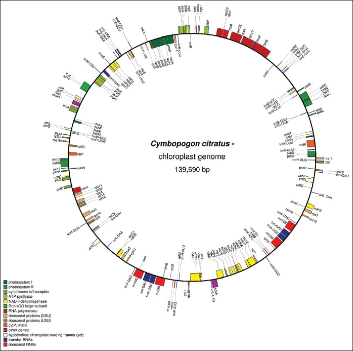 A complete circular chloroplast genome of 139,690 bps was generated and annotated without any gap for lemon grass.