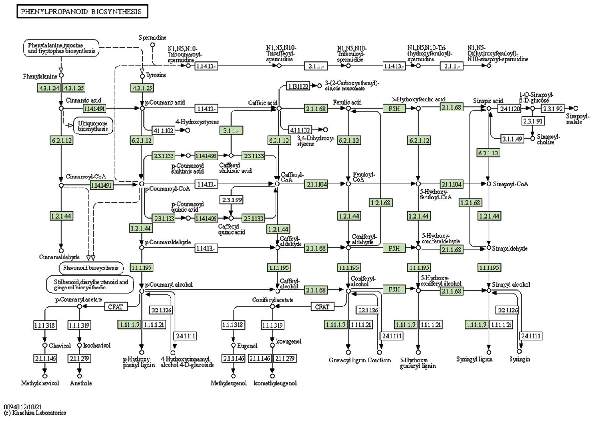 The study identified genes associated with metabolites and secondary metabolites of lemon grass. Metabolites and secondary metabolites are essential for producing essential oils in lemon grass. Table 2 summarizes lemon grass’s KO ID, gene count, and metabolic pathways [Figure 1 and Supplementary Figures 11-33]. The number of genes identified in purine metabolism, cysteine and methionine metabolism, glycerophospholipid metabolism, pyruvate metabolism, starch and sucrose metabolism, and pyrimidine metabolism is 43, 43, 35, 32, 31, and 30, respectively. Similarly, this study identifies fifteen genes in sulfur metabolism, sphingolipid, alpha-Linolenic acid, phenylalanine, tryptophan, and Beta-alanine.
