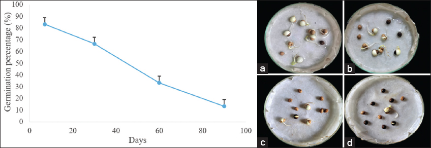 In this present experiment [Figure 1], freshly collected untreated seeds show a gradual decline in germination rate as the seeds getting old until 3 months. 7-day-old seeds register a maximum germination percentage (83.33 ± 5.7) among untreated seed sets. For 3-month-old seed set, there was a sharp fall in germination rate (13.33 ± 5.7). One month and 2-month-old seeds show moderate to low germination ability (66.66 ± 5.7 and 33.33 ± 5.7, respectively). Hence from the above result, it is clear that the seeds of T. cordifolia did not show any dormancy but exhibit a gradual decrease in germination percentage within 3 months.