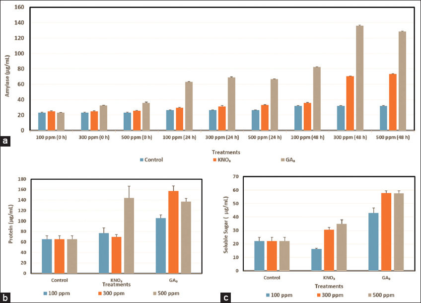 It is a well-known fact that during the germination of a seed, primary metabolites such as the number of soluble sugars, proteins, and some enzymes like amylase, and protease are increased in the imbibed seeds that help in the germination [15]. In addition, the chemicals which help in the germination of a seed also enhance the number of primary metabolites as well as promote activation in germinating seeds. In this present study, we have measured the number of soluble sugars, proteins, and amylase activity to investigate the germinating capacities of KNO3 and GA3 in the germination of T. Cordifolia seeds [Figure 4].
