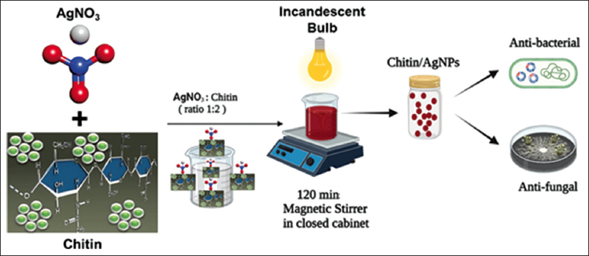 | Figure 1: Schematic illustration for the synthesis of the chitin-AgNPs. [Click here to view] |