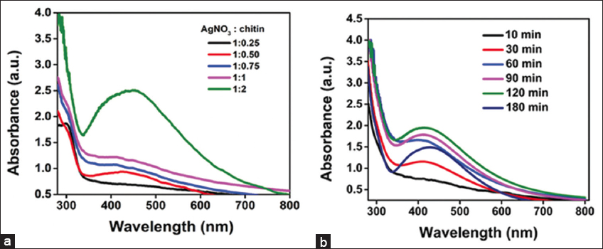 | Figure 2: UV-visible absorption spectra of chitin-AgNPs (a) at different amounts of chitin and (b) at different reaction times. [Click here to view] |