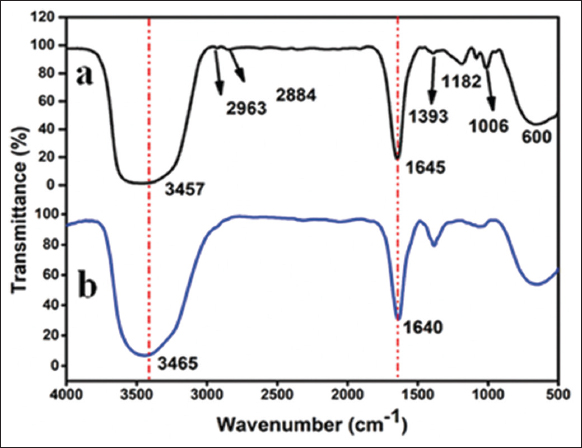 | Figure 3: FT-IR spectra of (a) chitin and (b) chitin-AgNPs. [Click here to view] |