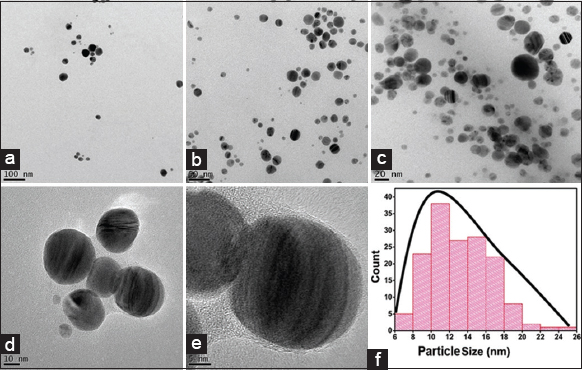 The morphology and dispersion ability of the synthesized chitin-AgNPs were examined using low-resolution TEM and HRTEM analysis [Figure 4]. The TEM images of the as-prepared chitin-AgNPs revealed a spherical morphology with uniform dispersion [Figure 4a-e]. By analyzing the TEM images using Image J software, the average particle size of chitin-AgNPs was determined to be in the range of 10–30 nm. The particle size distribution of the chitin-AgNPs, depicted in the histogram [Figure 4f], was calculated using Origin software (Gaussian distribution).