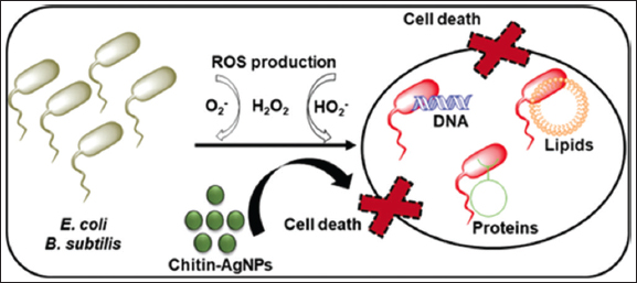 | Figure 8: Schematic illustration for the antibacterial activity of chitin-AgNPs through ROS production. [Click here to view] |