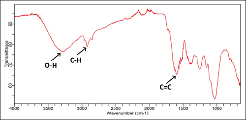 | Figure 2: Sample FTIR spectrum of the Orthosiphon stamineus leaf from Tawangmangu. [Click here to view] |