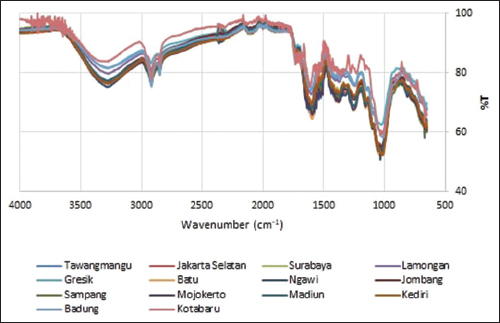The results of this research will also further strengthen previous researches involving FTIR fingerprinting for OS quality evaluation. For example, Heryanto et al. evaluated OS collected from 5 locations on Java Island (Indonesia) using transmission spectroscopy techniques, and then the FTIR spectra of the samples were analyzed using PCA and PLSDA [25]. Meanwhile, Yuliantini et al. used transmission spectroscopy to make FTIR-fingerprinting of OS and its adulterant namely Eupatorium riparium, then used PCA to differentiate between the two [26]. Furthermore, Ahda et al. used FTIR with reflectance spectroscopy technique (ATR FTIR) to differentiate OS extracted with ethanol at various concentrations (20,40, 60, 80, and 80%) [27].