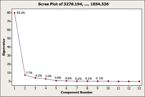 | Eigenvalue | 79.705 | 7.328 | 4.099 | 2.830 | 0.728 | 0.569 | 0.198 | 0.077 | 0.051 | 0.037 | 0.013 | 0.005 | 0.000 |