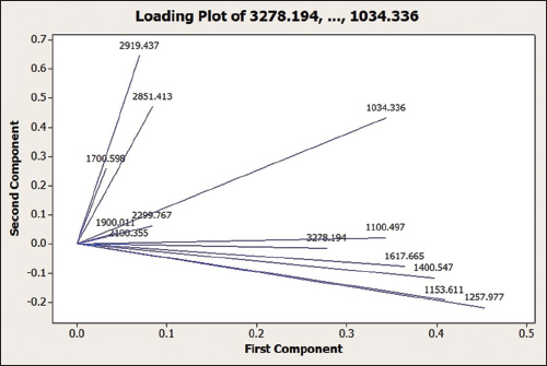 A loading plot (Figure 5) shows the degree of correlation between each variable and how strongly each characteristic can affect PC. The narrower the angle formed between two vectors, the stronger the positive influence a variable has on a PC, whereas an angle closer to 180° indicates a stronger negative correlation. In contrast, an angle closer to 90° means it is more likely that the two are not related. For example, as seen in Figure 5, the peaks at the wavenumbers 2919.437 cm-1 and 1257.977 cm-1 show no correlation between the two, whereas those at 2919.437 cm-1 and 1700.598 cm-1 have a positive correlation.