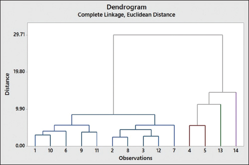 | Figure 7: Dendrogram obtained from cluster analysis with complete linkage. Number 1–14 denotes the sample origin: Tawangmangu, South Jakarta, Surabaya, Lamongan, Gresik, Batu, Ngawi, Jombang, Sampang, Mojokerto, Madiun, Kediri, Badung, and Kotabaru. [Click here to view] |