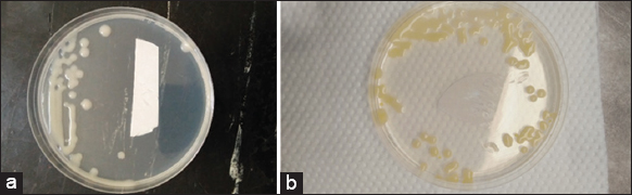 | Figure 3: (a) White colony of Xanthomonas phaseoli pv manihotis. (b) Yellow colony of Xanthomonas axonopodis pv cassavae after 24 h on YPGA Media [Click here to view] |