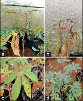 | Figure 4: (a and b) Blighted leaves, complete death in plants infected Xanthomonas phaseoli pv manihotis. (c) Angular leaf spots on plants infected Xanthomonas axonopodis pv cassavae. (d) Control plant inoculated with sterile distilled water. [Click here to view] |