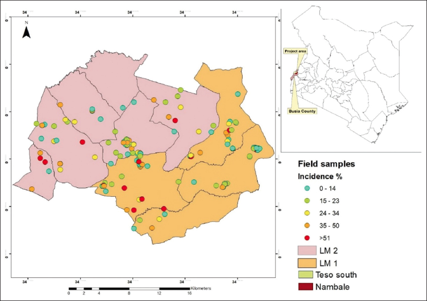 | Figure 5: Incidence of cassava bacterial blight across Busia County. [Click here to view] |