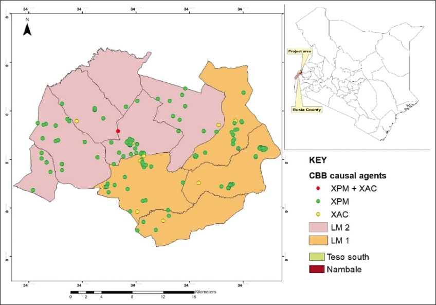 | Figure 6: Distribution of cassava bacterial blight causal agents Xanthomonas phaseoli pv manihotis (XPM) and Xanthomonas axonopodis pv cassavae (XAC) in Busia County. [Click here to view] |