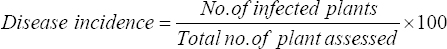 Cassava plants were assessed for CBB along two diagonals within the farm by randomly selecting 30 plants [11]. The disease incidence was determined as the number of plants exhibiting CBB symptoms over the total number of plants assessed multiplied by 100% to obtain the percentage: