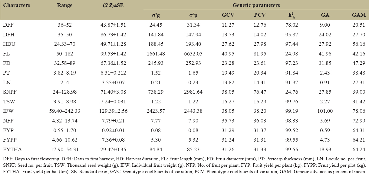 The GA as percentage was greater for all the characters [Table 1] but greater in case of single fruit weight (78.06%), fruit number per plant (72.99%), fruit yield per plant (64.31%), per plot (64.21%), and ton per hectare (64.24%), harvest duration (56.16%), fruit diameter (47.29%), and FL (42.16%). Consistent findings were found in the present study with those of yield per plant [38]; for days to 50% flowering, number of fruits per plant, fruit diameter, FL and yield/plant in chili [18]. There is a lot of opportunity for improvement in future breeding program if estimated heritability is high as well high GA [39].