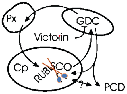 Victorin inhibits the photorespiratory enzyme glycine decarboxylase, which cleaves RUBISCO and leads to cell death by exchanging protons between Cps, mitochondria, and peroxisomes as mentioned in Figure 1 [46]. Victorin also causes laddering of DNA and condensation of heterochromatin, the common signs of apoptosis [47-49]. Victorin shrinks cells and lowers mitochondrial membrane potential, according to Curtis and Wolpert (2004), without compromising the integrity of the plasma membrane or the tonoplast [50]. Animals undergo Victorine-like apoptosis as a result of calcium ion efflux, oxidative burst, serine and cysteine proteases, and nuclease activity [47-49]. Therefore, transcriptional and/or metabolic reprogramming of host cells, which results in the stimulation of a cellular suicide pathway, is probably what causes victorin-induced cell death [45].