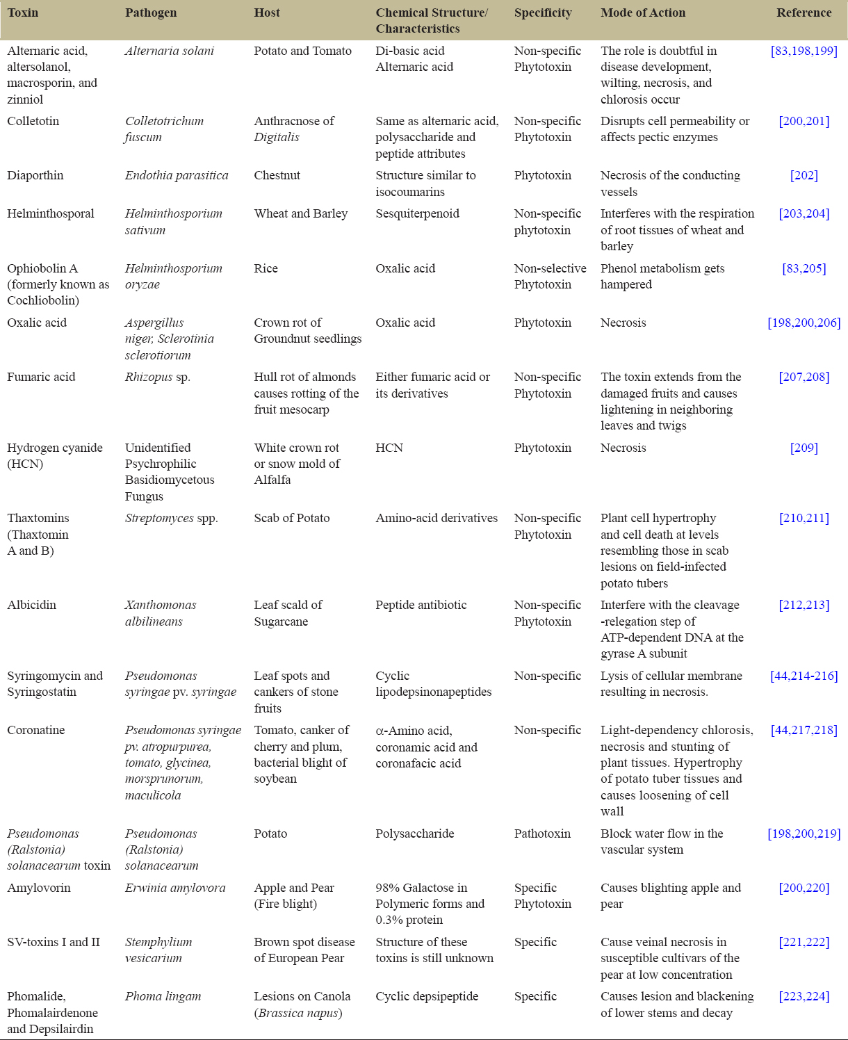 According to Wheeler and Luke [20], there are three types of toxins, namely phytotoxins, vivotoxins, and pathotoxins as mentioned in Table 1.