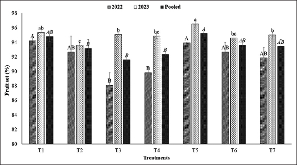 | Figure 2: Fruit set (%) of strawberry plants grown at different levels of verticals under different treatments. [Click here to view] |