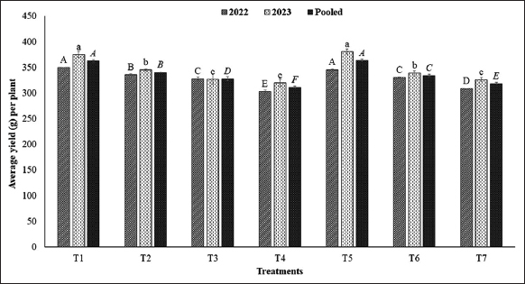 | Figure 3: Average yield (g/plant) of strawberry grown at different levels of verticals under different treatments. [Click here to view] |
