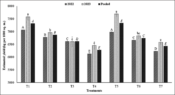 | Figure 4: Estimated yield (kg per 1000 sq.m.) of strawberry grown at different levels of verticals under different treatments. [Click here to view] |