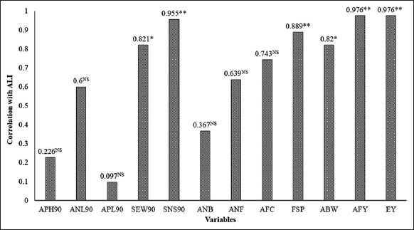 | Figure 5: Correlation between available light intensity through natural and artificial full spectrum light and various growth and yield parameters. [Click here to view] |
