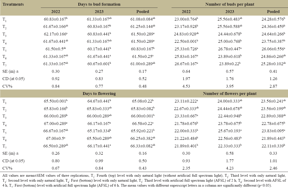 All values are mean±SEM values of three replications, T1: Fourth (top) level with only natural light (without artificial full spectrum light), T2: Third level with only natural light, T3: Second level with only natural light, T4: First (bottom) level with only natural light, T5: Third level with artificial full spectrum light (AFSL) of 2 h, T6: Second level with AFSL of 4 h, T7: First (bottom) level with artificial full spectrum light (AFSL) of 6 h. The mean values with different superscript letters in a column are significantly different (p<0.05).